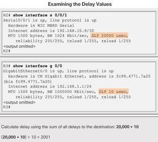 | Delay Metric Delay is the measure of the time it takes for a packet to traverse a route. The delay (DLY) metric is a static value based on the type of link to which the interface is connected and is expressed in microseconds. ** Delay is not measured dynamically. In other words, the router does not actually track how long packets take to reach the destination. The delay value, much like the bandwidth value, is a default value that can be changed by the network administrator. | |