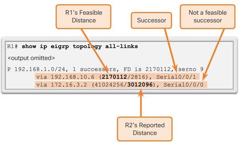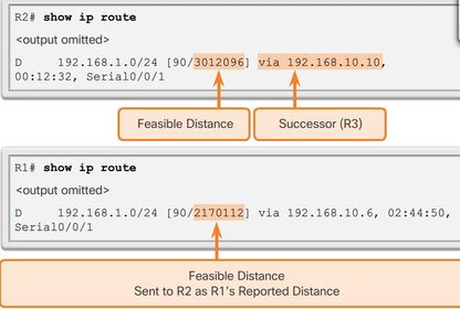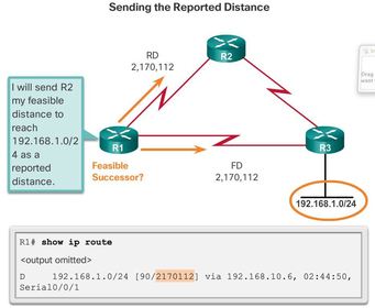 | Feasible Successors, Feasibility Condition, and Reported Distance Ej: R1’s feasible distance to 192.168.1.0/24 is 2,170,112. * R1 reports to R2 that its FD to 192.168.1.0/24 is 2,170,112. * From R2’s perspective, 2,170,112 is R1’s RD. R2 uses this information to determine if R1 meets the FC and, therefore, can be an FS. | |