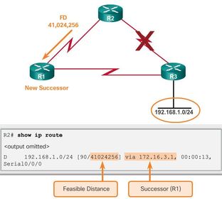 | Feasible Successors, Feasibility Condition, and Reported Distance Ej: R1 is now an FS for R2 to the 192.168.1.0/24 network. If there is a failure in R2’s path to 192.168.1.0/24 via R3 (successor), then R2 immediately installs the path via R1 (FS) in its routing table. * R1 becomes the new successor for R2’s path to this network, | |
