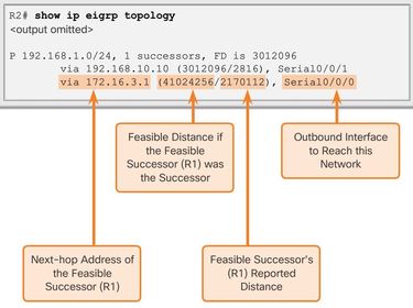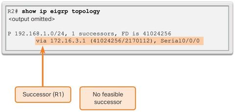 | Ej: ? the topology table displays: the second subentry shows the FS, R1 (if there is not a second entry, then there are no FSs): * via 172.16.3.1 - Next-hop address of the FS, R1. * 41024256 - R2’s new FD to 192.168.1.0/24, if R1 became the new successor and would be the new metric displayed in the IP routing table. * 2170112 - RD of the FS, or R1’s metric to reach this network. RD must be less than the current FD of 3,012,096 to meet the FC. | |