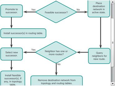| Introduction to DUAL The decision process for all route computations is done by the DUAL Finite State Machine (FSM). An FSM is a workflow model, similar to a flow chart that is composed of the following: * A finite number of stages (states) * Transitions between those stages * Operations | The DUAL FSM tracks all routes, uses EIGRP metrics to select efficient, loop-free paths, and identify the routes with the least-cost path to be inserted into the routing table. ** Recomputation of the DUAL algorithm can be processor-intensive. EIGRP avoids recomputation whenever possible by maintaining a list of backup routes that DUAL has already determined to be loop-free. If the primary route in the routing table fails, the best backup route is immediately added to the routing table. |