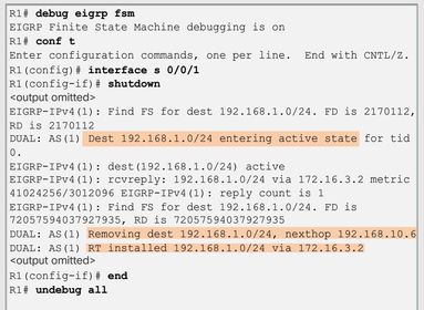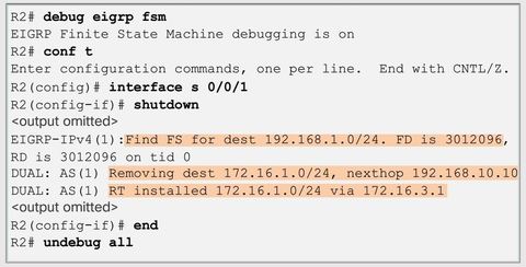 | DUAL: Feasible Successor Ej: To understand how DUAL can use a FS when the path using the successor is no longer available, a link failure is simulated between R2 and R3. Before simulating the failure, DUAL debugging must be enabled using the debug eigrp fsm command on R2, as shown in Figure 3. A link failure is simulated using the shutdown command on the Serial 0/0/1 interface on R2. | |