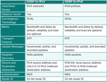 | Comparing EIGRP for IPv4 and IPv6 * Distance vector - Both protocols use the same administrative distances. * Transport protocol - The Reliable Transport Protocol (RTP) is responsible for guaranteed delivery of EIGRP packets to all neighbors * Update messages - Both EIGRP for IPv4 and IPv6 send incremental updates when the state of a destination changes. The terms, partial and bounded, are used when referring to updates for both protocols. * Source and destination addresses - EIGRP for IPv6 messages are sourced using the IPv6 link-local address of the exit interface | |