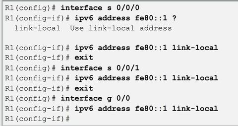 | Configuring IPv6 Link-local Addresses Link-local addresses can be configured manually using the same interface configuration mode command used to create IPv6 global unicast addresses, but with different parameters: Router(config-if)# ipv6 address (link-local-address) link-local A link-local address has a prefix within the range FE80 to FEBF. When an address begins with this hextet (16-bit segment), the link-local keyword must follow the address. * Use Exit before configuring the next interface | |