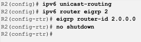 | Configuring the EIGRP for IPv6 Routing Process Ej: ? global configuration mode command enables IPv6 routing on the router. This command is required before any IPv6 routing protocol can be configured. Router(config)# ipv6 router eigrp (autonomous-system) Router(config-rtr)# eigrp router-id (32 bit value) ** By default, the EIGRP for IPv6 process is in a shutdown state. The no shutdown command is required to activate the EIGRP for IPv6 process ** Both the no shutdown command and a router ID are required for the router to form neighbor adjacencies. | |