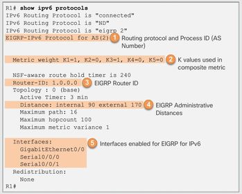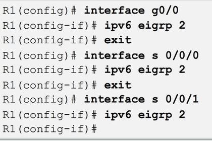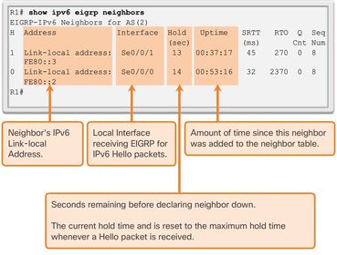 | Verifying EIGRP for IPv6: Examining Neighbors The show ipv6 eigrp neighbors command is useful for verifying and troubleshooting EIGRP for IPv6. ** If an expected neighbor is not listed, ensure that both ends of the link are up/up using the show ipv6 interface brief command. The same requirements exist for establishing neighbor adjacencies with EIGRP for IPv6 as it does for IPv4. | If both sides of the link have active interfaces, check to see: * Are both routers configured with the same EIGRP autonomous system number? * Is the interface enabled for EIGRP for IPv6 with the correct autonomous system number? |