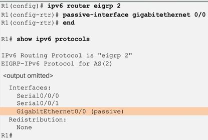 | Verifying EIGRP for IPv6: show ip protocols Command Ej: ? command displays the parameters and other information about the state of any active IPv6 routing protocol processes currently configured on the router. The Interfaces section shows which interfaces EIGRP for IPv6 have been enabled. This is useful in verifying that EIGRP is enabled on all of the appropriate interfaces with the correct autonomous system number. | |