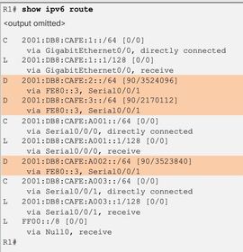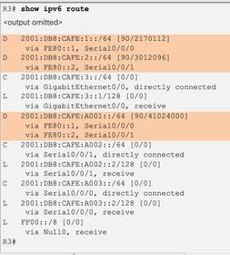 | Verifying EIGRP for IPv6: Examine the IPv6 Routing Table Ej: All three routes are using router R3 as the next-hop router (successor). Notice that the routing table uses the link-local address as the next-hop address. Because each router has had all its interfaces configured with a unique and distinguishable link-local address, it is easy to recognize that the next-hop router via FE80::3 is router R3. | |