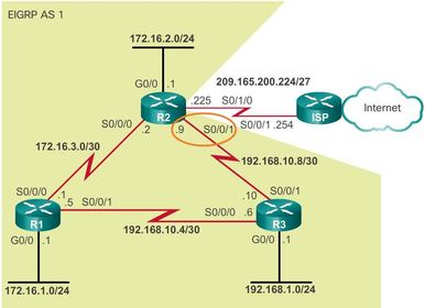 | Topology Table: No Feasible Successor ** The IP routing table only includes the best path, the successor. To see if there are any FSs, we must examine the EIGRP topology table. The topology table in Figure only shows the successor 192.168.10.6, which is R3. There are no FSs. By looking at the actual physical topology or network diagram, it is obvious that there is a backup route to 192.168.1.0/24 through R2. R2 is not an FS because it does not meet the FC. Ej: Although, looking at the topology, it is obvious that R2 is a backup route, EIGRP does not have a map of the network topology. EIGRP is a distance vector routing protocol and only knows about remote network information through its neighbors. | |