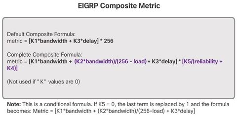 | EIGRP Composite Metric By default, EIGRP uses the following values in its composite metric to calculate the preferred path to a network: * Bandwidth - The slowest bandwidth among all of the outgoing interfaces, along the path from source to destination. * Delay - The cumulative (sum) of all interface delay along the path (in tens of microseconds). Note: Although the MTU is included in the routing table updates, it is not a routing metric used by EIGRP. | The following values can be used, but are not recommended, because they typically result in frequent recalculation of the topology table: * Reliability - Represents the worst reliability between the source and destination, which is based on keepalives. * Load - Represents the worst load on a link between the source and destination, which is computed based on the packet rate and the configured bandwidth of the interface. |