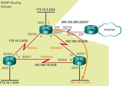 | Calculating the EIGRP Metric - Bandwidth EIGRP divides a reference bandwidth value of 10,000,000 by the interface bandwidth value in kb/s. This results in higher bandwidth values receiving a lower metric and lower bandwidth values receiving a higher metric. Ej: 10,000,000 is divided by 1,024. If the result is not a whole number, then the value is rounded down. In this case, 10,000,000 divided by 1,024 equals 9,765.625. The .625 is dropped to yield 9,765 for the bandwidth portion of the composite metric | |