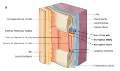 | PARED TORÁCICA | Tres capas de músculos -Externa: intercostales externos -Media: intercostales internos -Paquete neurovascular- -Interna: intercostales profundos |