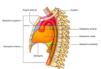 | PORCIONES DEL MEDIASTINO | -Superior: De la horquilla esternal al ángulo de Louis -Inferior: Del ángulo de Louis a vértebra dorsal 12, costilla 12 y ángulo xifoideo |