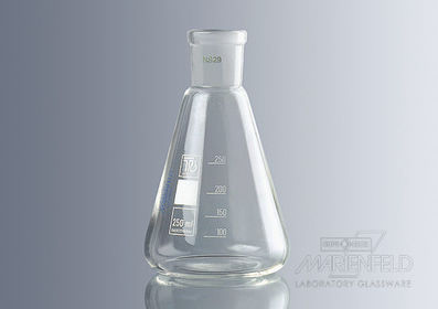 | Matraz Erlenmeyer Es un recipiente de vidrio tiene forma de cono y tiene cuello cilíndrico, es plano por la base.Se utiliza para calentar líquidos cuando hay peligro de que éste se evapore. | |