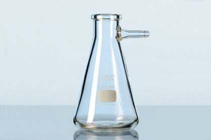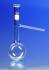 | Matraz de kitasato. Podría decirse que es como un matraz de Erlenmeyer con un tubo de desprendimiento. Sirve para realizar experimentos con agua, como destilación, recolección de gases hidroneumática , filtraciones al vacío, etc. | |
