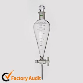 | Embudo de separación También llamado embudo de decantación es utilizado para separa dos líquidos inmiscibles. en la parte de arriba tiene una embocadura que puede ser tapada y abajo un grifo que sirve para regular el líquido. | |