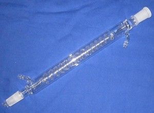 | El condensador/refrigerante es un aparato de laboratorio, hecho en vidrio, que es usado para condensar los vapores que se desprenden del matraz de destilación, por medio de un líquido refrigerante que circula por éste, normalmente agua. | |
