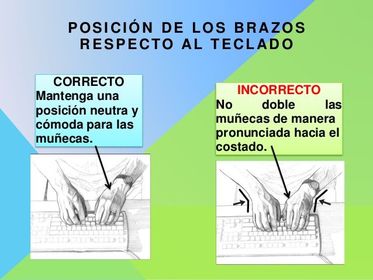 | Posición de los brazos respecto al teclado | los brazos deben formar un ángulo recto de 90º, de manera que el antebrazo y la mano siempre estén en forma recta. La espalda debe estar apoyada en el respaldo, en posición erguida y con los hombros relajados. |