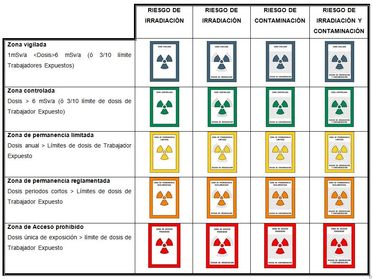 | ZONA VIGILADA ZONA CONTROLADA - DE PERMANENCIA LIMITADA - DE PERMANENCIA REGLAMENTADA - DE ACCESO PROHIBIDO | En las zonas controladas con riesgo de exposición externa será obligatorio el uso de dosímetros individuales. Cuando exista riesgo de contaminación será obligatoria la utilización de equipos de protección individual. En las zonas vigiladas debe efectuarse al menos mediante dosimetría de área, una estimación de las dosis que puedan recibirse. |
