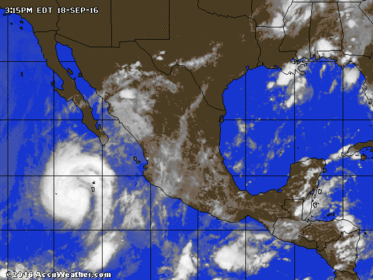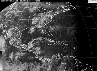 IMAGEN VISIBLE | Los objetos con más alto albedo (capacidad de reflejar luz del sol) parecen más brillantes en la imagen de satélite Visible. Los objetos con más bajo albedo parecen oscuros en este tipo de imagen. La imagen visible está sólo disponible durante la luz del día (en la imagen de la derecha muestra que la costa de Oeste todavía no veía la salida del sol aún.) |