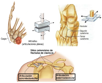 | ARTICULACIÓNES: SINOVIALES NO AXIALES (ARTRODIA) ______________________________________ * Permiten movimientos de deslizamiento. * El movimiento que realizan no se produce alrededor de un eje o a lo largo de un plano. * Sus superficies articulares son planas. ______________________________________ | Ejemplos: - Art. Intercarpianas. - Art. Intertarsianas. - Art. interclaviculares. - Art. Esternocostales. - Art. Vertebrocostales. |