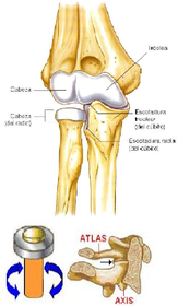 | ARTICULACIÓNES: SINOVIALES UNIAXIALES (TROCOIDE O PIVOTE) ______________________________________ * Permiten movimientos de rotación interna y externa. * El movimiento que realizan se produce alrededor de su propio eje longitudinal y en un plano trasversal. ______________________________________ | Ejemplos: - Art. Radiocubital proximal. - Art. Atlantoaxoidea. |