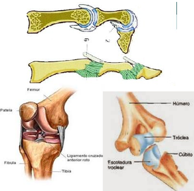 | ARTICULACIÓNES: SINOVIALES UNIAXIALES (TROCLEAR) ______________________________________ *Permiten movimientos de flexión y extensión. *El movimiento que realizan se produce alrededor de un solo eje de manera horizontal y en un plano sagital. | Ejemplos: - Art. Húmero-cubital (húmero-ulnar), - Art. Fémuro tibial. - Art. Interfalangicas proximal y distal. |