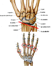 | ARTICULACIÓNES: SINOVIALES BIAXIALES (CONDILEA) ______________________________________ * Permiten movimientos de flexión y extensión, abducción y aducción. * Poseen una superficie articular en forma ovoide (superficies: cóncava - convexa ). * El movimiento que realizan se produce alrededor de dos ejes y en los planos sagital y coronal. ______________________________________ | Ejemplos: - Art. metacarpofalángica. - Art. Radiocarpiana. |