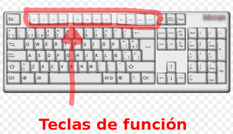 | Las teclas de función se sitúan el la parte superior del teclado alfanumérico, van del F1 al F12, y son teclas que aportan atajos en el uso del sistema informático. Por ejemplo, al pulsar F1 se suele activar la Ayuda del programa que se está usando. | |