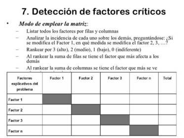 | La manera de utilizarlo es: | a. Listar tanto en las columnas como en las filas, todos los factores explicativos que surgen del listado de problemas y quedan dentro de la esfera de acción del organismo. b. Analizar el nivel de incidencia que cada factor tiene sobre los otros. Para este paso la pregunta clave es: Si se modifica el factor 1 ¿En qué medida se modifica el factor 2, el factor 3, el factor 4, el factor n? c. Establecer valores en el nivel de incidencia. Los valores sugeridos son Alto 3, Medio 2, Bajo 1, Nulo 0. d. Identificar los factores críticos, detectando cuáles suman mayores valores en la columna de totales, es decir los que tienen mayor nivel de incidencia sobre los otros. |