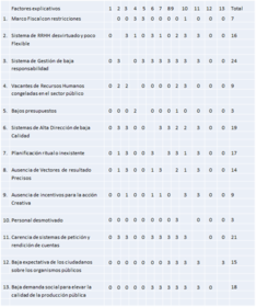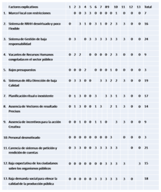 | De esta manera, se han cruzado los trece factores que están dentro del ámbito de acción de la política impulsada y se ha analizado el nivel de incidencia que tiene cada uno de ellos en los otros. La suma total de los valores asignados a cada uno de los factores, que se consigna en la última columna, indica que los factores con mayor nivel de incidencia son: -Factor 3. Sistema de Gestión de baja responsabilidad -Factor 11. Carencia de sistemas de petición y rendición de cuentas. -Factor 6. Sistemas de Alta Dirección de baja calidad. -Factor 13. Baja demanda social para elevar la calidad de la producción pública. Por lo tanto, en este ejemplo, estos cuatro factores adquirirán la categoría de “Factores Críticos” del Problema Focal seleccionado | |