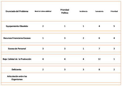 | 3-.Establecer pesos relativos para cada enunciado en cada criterio. Cada uno de los pesos que se asignen debe estar basado en información y debe obtener el consenso del equipo de trabajo. Se propone la siguiente escala de pesos. Alto:3, Medio:2, Bajo:1, Nulo: 0. 4-.Establecer las prioridades basándose en el análisis de los enunciados y la ponderación de cada uno de ellos en la última columna | Establecimiento del Orden de Prelación |