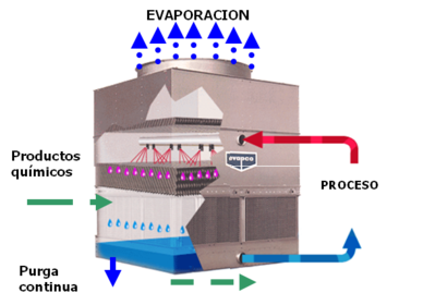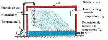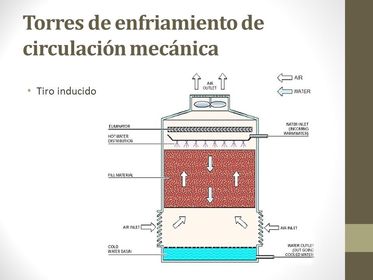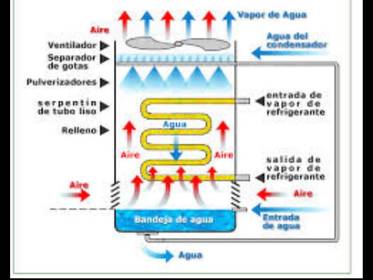 | Descripción de una torre de enfriamiento | El liquido caliente entra en la torre de refrigeración, mediante un ventilador, esta se distribuye dentro de la torre mediante boquillas, el enfriamiento ocurre cuando el liquido entra en contacto con un flujo de aire que entra dentro de el a contra corriente, el aire tiene que estar a una temperatura menor que la del liquido, esto ocurre mediante transferencia de masa, y el liquido enfriado sale por la parte de abajo de la torre. |