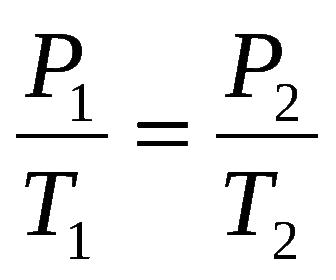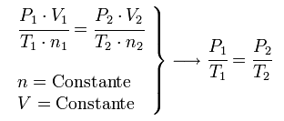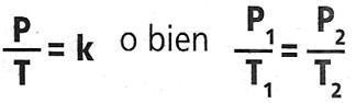 | Si el volumen de una cierta cantidad de gas a presión moderada se mantiene constante, el cociente entre presión y temperatura (kelvin) permanece constante: donde: (P/T)=K o (P1/T1)=(P2/T2) P es la presión T es la temperatura absoluta (es decir, medida en kelvin) k3 una constante de proporcionalidad | |