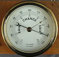 | La presión atmosférica se mide por un dispositivo llamadp barómetro. El tipo más sencillo de barómetro. En altas y bajas presiones se define como "presión atmosférica" el peso de una columna de aire sobre un lugar determinado. Esto es debido a que la gravedad de la Tierra confiere un peso al aire y este peso es lo que nosotros llamamos presión atmosférica. El peso de la columna de aire se mide a la altura del nivel medio del mar, donde una columna de 1 cm² de base pesa en promedio 1,03323 kilopondio [kp] o bien 10,1325 Newton [N]. Al expresar el peso de la columna de aire por cada unidad de superficie, la unidad de medida utilizada es el Pascal [Pa] equivalente a 1 Newton/metro² [N/m²], siendo entonces la presión atmosférica normal 101.325 Pa o más comunmente expresada como 1.013,25 hPa (hectoPascales). Otra equivalencia en desuso es la de hablar de que la presión atmosférica es de 760 mmHg (milímetros de mercurio) o bien 760 Torr. | |