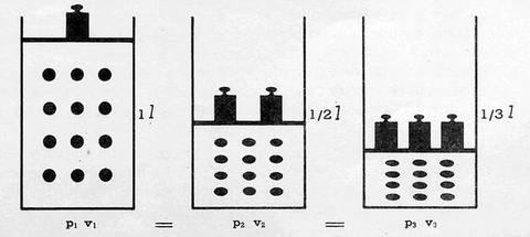 | La presión ejercida por una fuerza física es inversamente proporcional al volumen de una masa gaseosa, siempre y cuando su temperatura se mantenga constante. o en términos más sencillos: A temperatura constante, el volumen de una masa fija de gas es inversamente proporcional a la presión que este ejerce. Matemáticamente se puede expresar así: PV=K donde k es constante si la temperatura y la masa del gas permanecen constantes. Cuando aumenta la presión, el volumen baja, mientras que si la presión disminuye el volumen aumenta. No es necesario conocer el valor exacto de la constante k para poder hacer uso de la ley: si consideramos las dos situaciones de la figura, manteniendo constante la cantidad de gas y la temperatura, deberá cumplirse la relación: P1V1=P2V2 | |