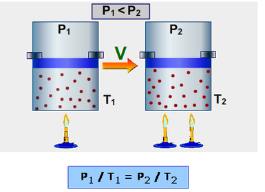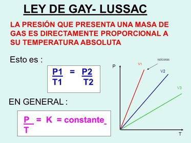 | La ley de Gay-Lussac establece que la presión de un volumen fijo de un gas, es directamente proporcional a su temperatura. | |