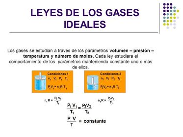 | La ley de los gases ideales es la ecuación de estado del gas ideal, un gas hipotético formado por partículas puntuales sin atracción ni repulsión entre ellas y cuyos choques son perfectamente elásticos (conservación de momento y energía cinética). La energía cinética es directamente proporcional a la temperatura en un gas ideal. Los gases reales que más se aproximan al comportamiento del gas ideal son los gases monoatómicos en condiciones de baja presión y alta temperatura. En 1648, el químico Jan Baptista van Helmont creó el vocablo gas, a partir del término griego kaos (desorden) para definir las génesis características del anhídrido carbónico. Esta denominación se extendió luego a todos los cuerpos gaseosos y se utiliza para designar uno de los estados de la materia. | |