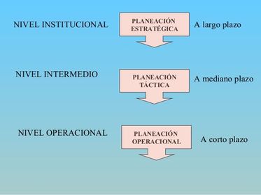 | La Planeación: es la función administrativa que determina con anticipación qué se debe hacer y cuáles objetivos se deben alcanzar, busca brindar condiciones racionales para la empresa, sus departamentos o divisiones se organicen a partir de ciertas hipótesis respecto de la realidad actual y futura. | PLANEACIÓN TÁCTICA. En una organización la planeación táctica ocupa el segundo lugar en los niveles de la planeación ,es la encargada de diseñar los planes a mediano plazo y proyectar las actividades a nivel departamental de la empresa, con el fin de concretar los lineamientos de la planeación estratégica y abrir el campo de acción ... |