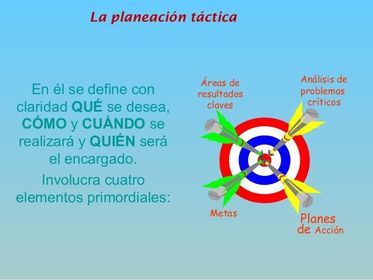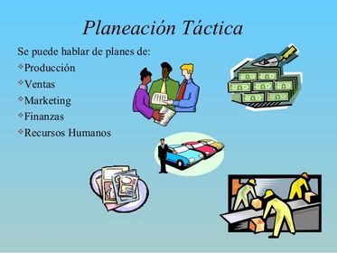 | Toma de decisiones en la Planeación Táctica. En este nivel, la Planeación Táctica toma un concepto de toma deliberada y sistemática de decisiones que incluyen propósitos más limitados, plazos más cortos, áreas menos amplias y niveles medios en la jerarquía. La empresa representa un intento por integrar el proceso decisorio y alinearlo a la estrategia diseñada para orientar el nivel operacional en sus tareas y actividades con el fin de alcanzar los objetivos empresariales propuestos. Cabe destacar, que estos planes, por lo general de cinco años de duración, fluyen naturalmente desde los objetivos, políticas y estrategias establecidas en el plan estratégico.En la realidad los planes a plazo medio pueden tener subjetivos, subpolíticas y sub-estratégicas propias, y éstas son probablemente más detalladas que en el plan estratégico o plan a largo plazo. | Importancia de la Planeación Táctica La planeación táctica se refiere al empleo más efectivo de los recursos que se han aplicado para el logro de objetivos dados y específicos. La diferencia entre ambas consiste en el elemento tiempo implicado en los diversos procesos; mientras más largo es el elemento tiempo, más estratégica es la planeación. Por tanto, una planeación será estratégica si se refiere a toda la empresa; será táctica, si se refiere a gran parte de la planeación de un producto o de su publicidad. En conclusión, la planeación táctica es el proceso mediante el cual los planes en detalle son llevados a cabo,tomando en cuenta el desarrollo de los recursos para realizar la planeación estratégica. |