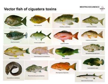Toxinas en pescados con aletas (ciguatera) | Periodo de latencia: 3 - 4 horas, o Sintomas: diarrea, nauseas, vomitos, entumecimiento y hormigueo de la cara, aberraciones del gusto y de la vista, convulsiones, paro cardiaco, muerte. Alimentos: pescados de arrecifes y islas, mero, barracuda, huachinango. Modo de contaminacion: (Esporadico) cadena alimenticia de las algas. Prevencion: comiendo solo pescados pequeños. |