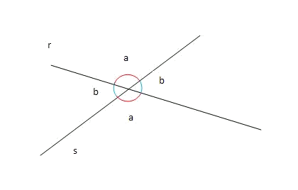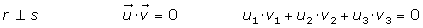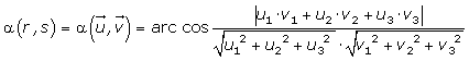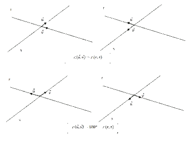 En el caso del dibujo el ángulo entre las rectas r y s sería rx=b. Una forma de determinar dicho ángulo es a partir del producto escalar de los vectores directores de las rectas r y s . Sean u y vectores u directores de las rectas r y s respectivamente. El producto escalar de los vectores u y u es: | Ahora, fijémonos que tomando un vector director de s y r uno de , el ángulo formado por dichos vectores coincide con el ángulo entre las dos rectas, si es agudo, o bien con su suplementario si es obtuso: |
