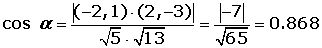 EJEMPLO 1 Así, si las pendientes de las rectas secantes l_1 y l_2 son m_1 y m_2 respectivamente se tiene que: rectas perpendiculares. Dos rectas son perpendiculares si el ángulo que forman mide 90°. Como tan90° no está definida en la expresión (m_1-m_2)/(1+m_1 m_2 ) Se dice que el denominador (1+m_1 m_2) debe ser igual a cero. Así, 1+m_1 m_2=0,luego m_1 m_2= -1 | Ejemplo 2 Calcular el ángulo que forman las rectas r y s, sabiendo que sus vectores directores son: vector= (-2, 1) y vector=(2, -3). |