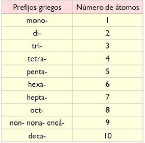 | Nomenclatura sistemática | Esta es el primer tipo de nomenclatura que se basa en nombrar los compuestos usando prefijos numéricos griegos que indican la atomicidad de cada uno de los elementos presentes en cada molécula. En la nomenclatura química se considera a la atomicidad como el número de átomos de un elemento en una sola molécula. La forma de nombrar los compuestos en este sistema es: prefijo-nombre genérico + prefijo-nombre específico. Prefijos griego – numero de atomos 1.- mono-1 2.- di- 2 3.- tri- 3 4.- tetra- 4 5.- penta-5 6.- hexa- 6 7.- hepta-7 8.- oct- 8 9.- non- nona- eneá-9 10.- deca- 10 EJEMPLOS: 1. FeO= Monoxido de monohierro 2. CO = Monóxido de Carbono 3. CuO= Monoxido de monocobre |