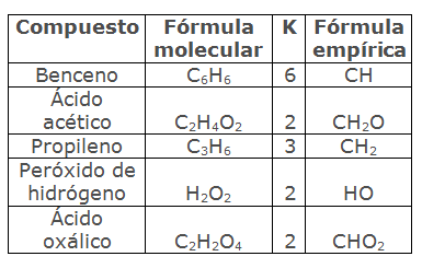 | FÓRMULA MOLECULAR Y FÓRMULA EMPÍRICA | Fórmula Molecular: Es la fórmula química que indica el número y tipo de átomos distintos presentes en la molécula. La fórmula molecular es la cantidad real de átomos que conforman una molécula. Fórmula Empírica: Es aquella que nos muestra la proporción entre los átomos de un compuesto químico. La fórmula empírica se puede usar tanto en compuestos formados por moléculas como en los que forman cristales y macromoléculas. Dato importante: La fórmula empírica nos informa únicamente de la proporción de átomos en un compuesto.La fórmula molecular nos informa de los átomos que hay en una molécula. |
