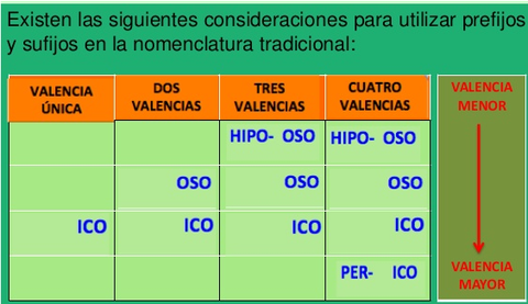 | Tradicional: | Este tipo de nomenclatura se determina de acuerdo al numero de valencia que tenga el elemento, utilizando prefijos y sufijos como: ! - 2 = Hipo ---- Oso 3 - 4 = ---------- Oso 5 - 6 = ----------- Ico 7 - Mas = Per ----Ico |