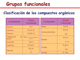 " CLASIFICACIÓN DE GRUPOS FUNCIONALES " | Los grupos funcionales se pueden clasificar por el tipo de elementos que los constituyen. Atendiendo a esta clasificación tenemos: Hidrocarburos: C, H Halógenos: C, H, F, Cl, Br, I Oxigenados: C, H, O Nitrogenados: C, H, N Principales grupos funcionales: ac. carboxílico, éster, amida, nitrilo, aldehído, cetona, alcohol, amina, éter, nitro, halógenos, aromático, alqueno y alquino |