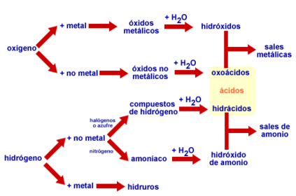 | OXIACIDOS | Son compuestos ternarios formados por un no metal, oxígeno e hidrógeno. Se obtienen a partir del óxido ácido o anhídrido correspondiente sumándole una molécula de agua (H2O). Donde H es el hidrógeno, N el no metal y O el oxígeno. |