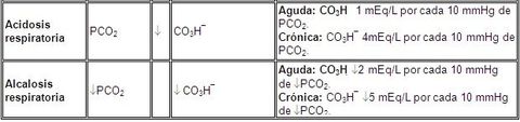 Alcalosis Respiratoria Crónica Mecanismo de adaptación fisiológica: grandes alturas o embarazo Anemia grave o enfermedad pulmonar Descenso de HCO3 por cada descenso de PCO2 | |