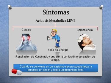CETOACIDOSIS Consecuencia del aumento de la producción de ácidos orgánicos. Falta Insulina--> acidos grasos libres de tejido adiposo, que son convertidos a cetoácidos en el hígado. Se producen a razón de 7mMol/min, superan la capacidad de eliminación; se produce septicemia grave. | ACIDOSIS LÁCTICA El ácido lácico es producto de la glucólisis anaerobica, este debe ser metabolizado en el hígado por reoxidación a piruvato. Puede producirse acidosis lactica en caso de hipoxia tisular, convulsiones, shock, incotxicación por C02 |